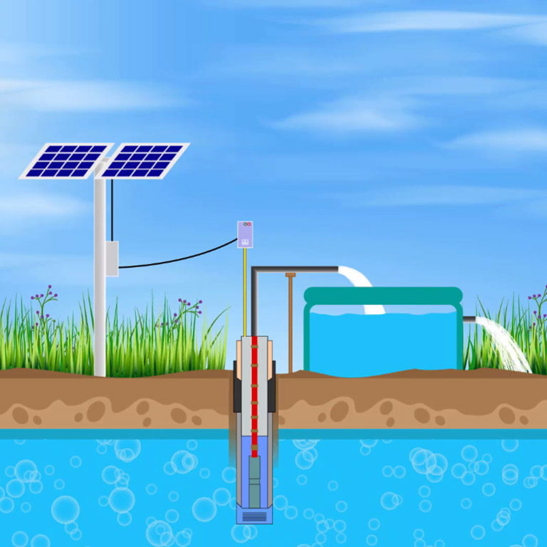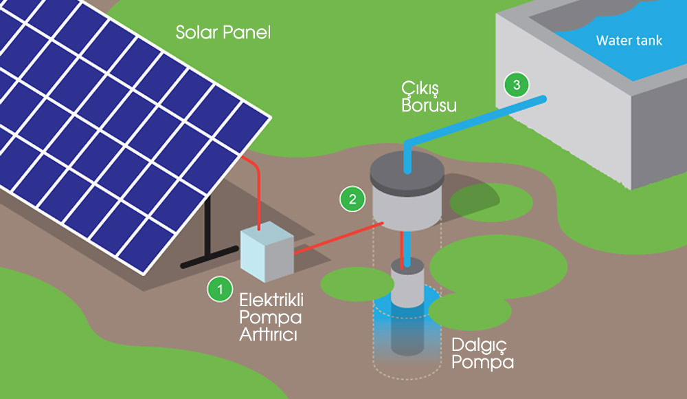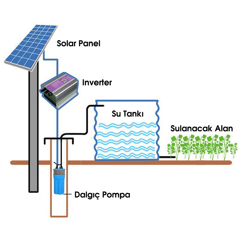 Sulama işlemi genellikle yer altı su kaynaklarına sondaj yöntemiyle ulaşılarak yapılır. Açılan kuyuya sarkıtılan sulama pompaları vasıtasıyla su yer altından veya kuyudan çekilerek sulama kanallarına ulaştırılır. Tarımsal sulamada güneş enerjisi sistemi mevcut olan AC pompanın off grid sistem ile beslenmesi ya da akü ve inverter kullanımı gerektirmeyen DC solar pompa sistemi kurulması şeklinde iki farklı tasarımla kullanılabilir. Verimli ve etkin olan çözüm DC solar pompa kurulumu yapılıp, ihtiyaç o an suyun depo ya da havuzdan karşılanması şeklindedir.